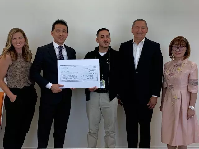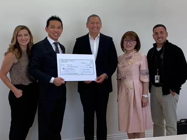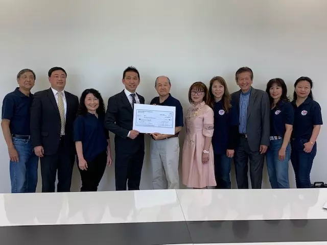 核桃市華人企業家古紹崙(左二)6月27日向Pomona Hope捐款1萬元。(記者楊青/攝影)核桃市華人企業家、Adesso創辦人古紹崙(Allen Ku)6月27日捐出4萬元,支持核桃、鑽石吧、羅蘭岡和波莫那及周邊地區四家非盈利組織的教育、文化、家庭和諧和社區安全工作。Pomona Hope、San Musae Cultural Center(聖幕文化)、Ju4y、TACF(社區治安人人有責群组)分別獲得1萬元。